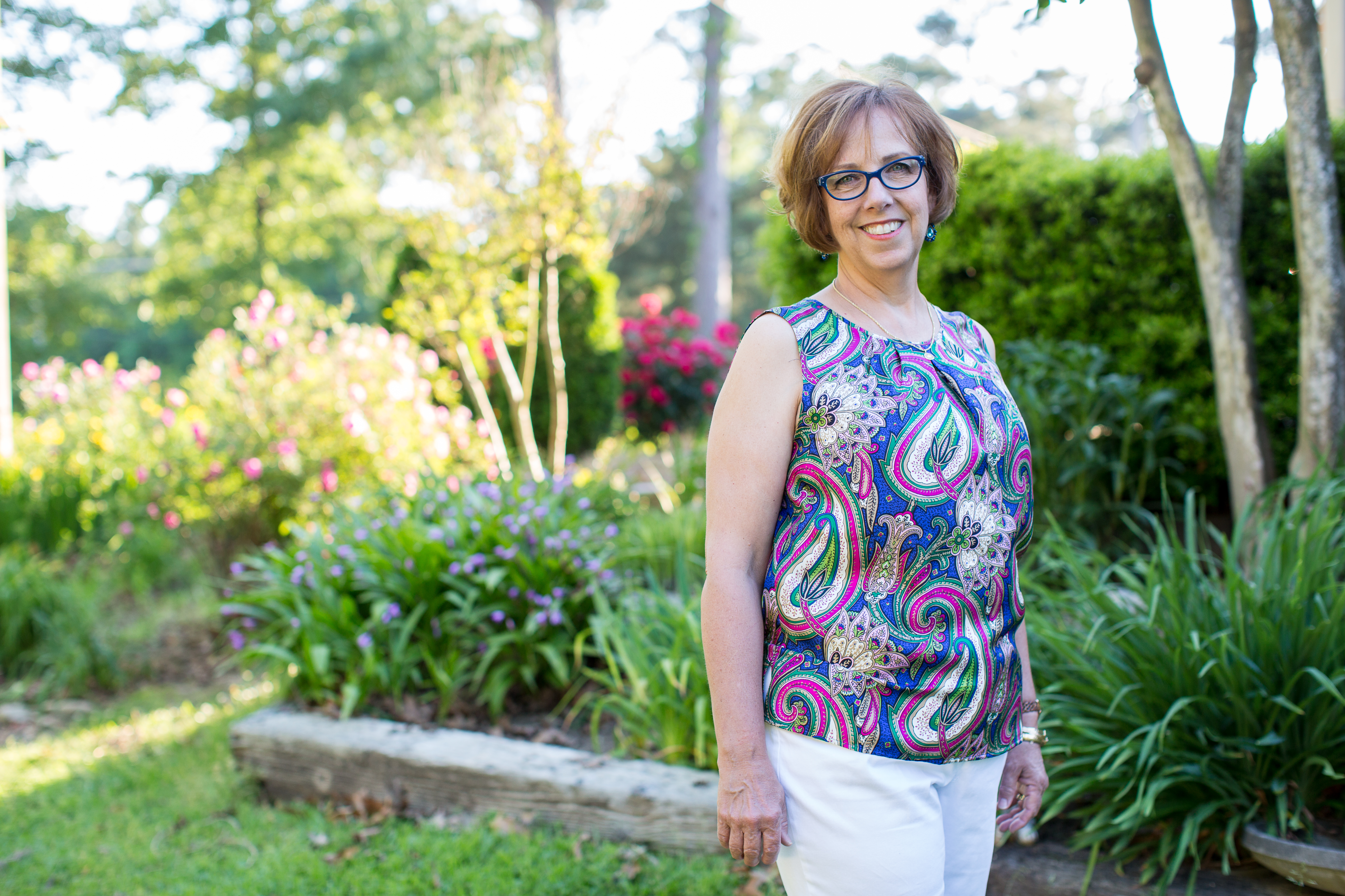 Top: Talbots, Pants: Laundry by Shelli Segal, Jewelry: her own, Glasses: Betsy Johnson