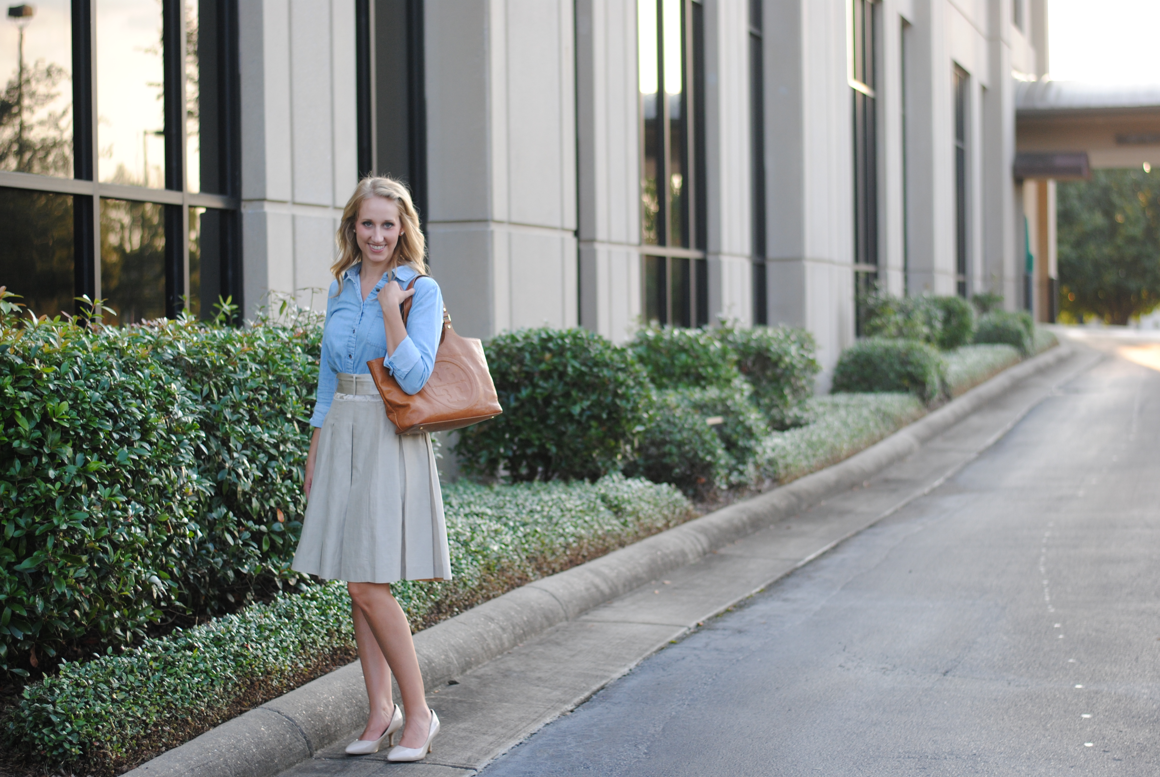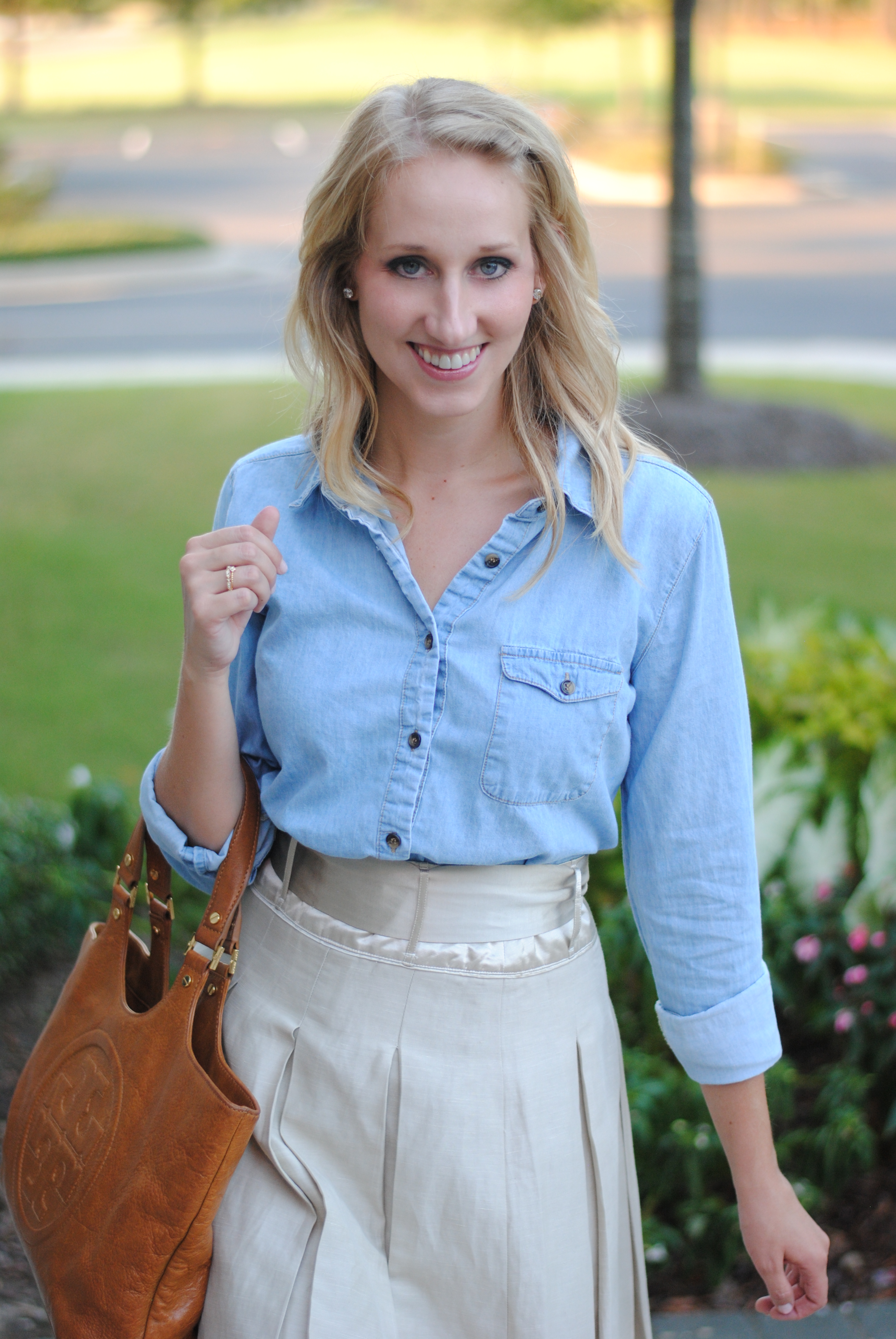 We are seeing signs of fall! But cool mornings and evenings and hot afternoons can make it difficult to know how to dress. This is when Pinterest comes in handy. I love to get “pinspiration” for dinner recipes, for hosting parties, and especially for putting outfits together! My most helpful board is called “outfits that already exist in my closet.” I began to see outfits that consist of pieces similar to what I already own but never thought to pair together, like this khaki skirt and chambray top. So, next time you’re staring into your closet thinking you have nothing to wear, look to pinterest for some “pinspiration.”