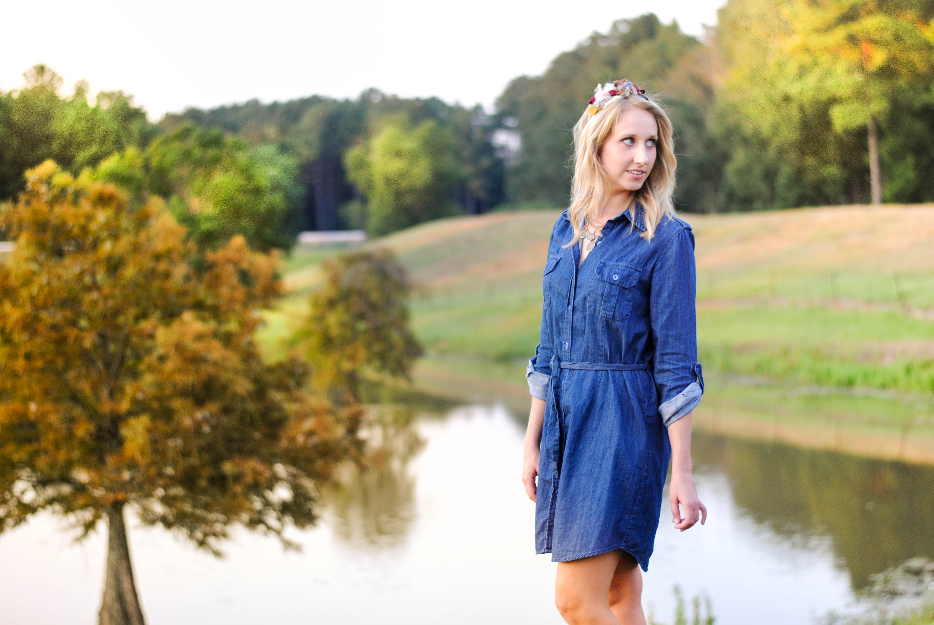 The tri-county area of Mississippi (Madison, Rankin, Hinds) offers wonderful local shopping from local artists and boutiques. This outfit displays just that. A common thought is that you can’t find very good deals at local stores but this is just not true! Local stores have to clear out their inventory during seasonal changes just like department stores and you can find some great deals! This outfilt is the perfect example. The denim dress was found on a 75% off rack at Highland Village, the headpiece was a great find at Mistletoe Marketplace, and the necklace was made by a local jeweler out of old coins from my grandmothers collection.
