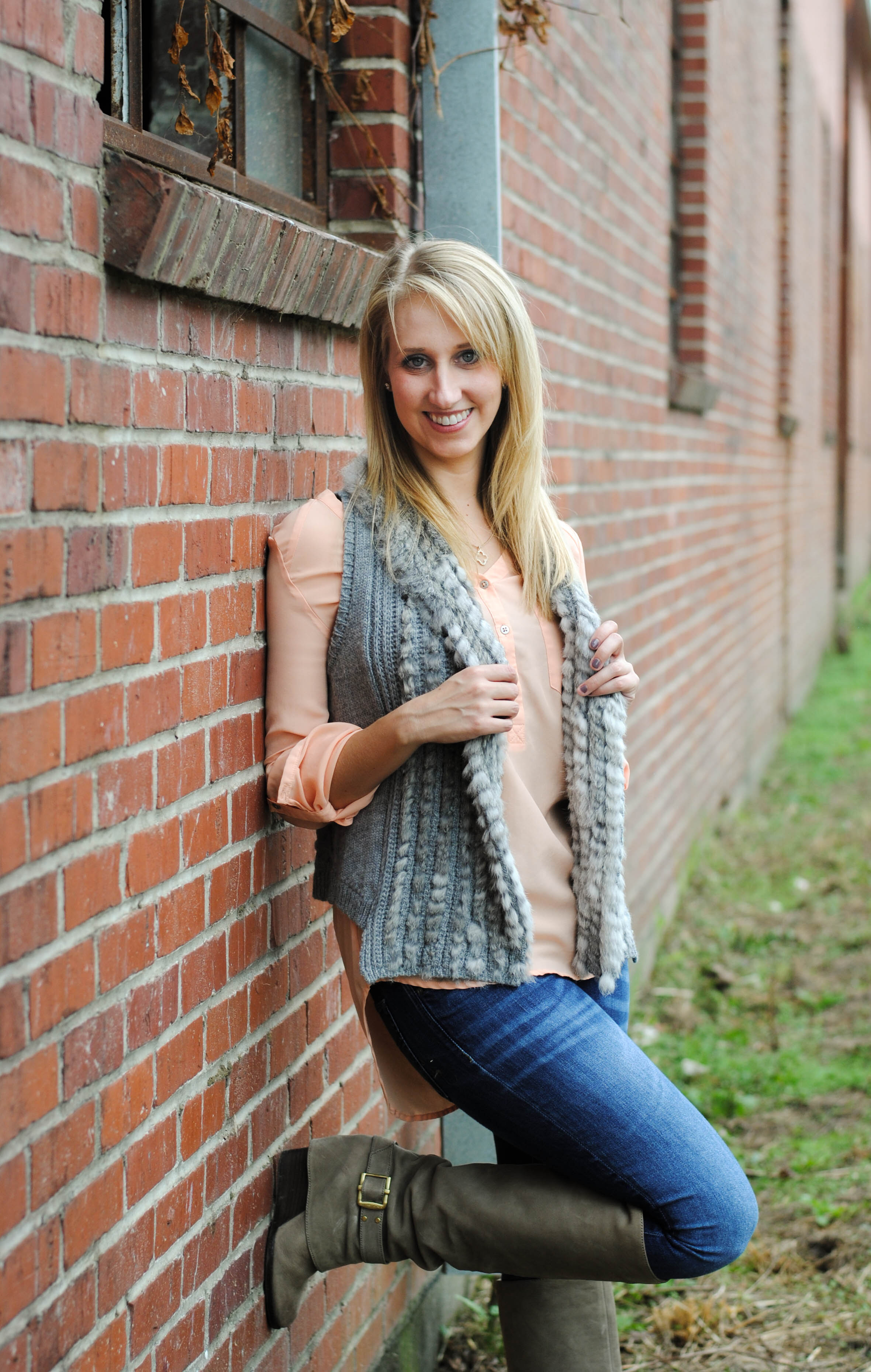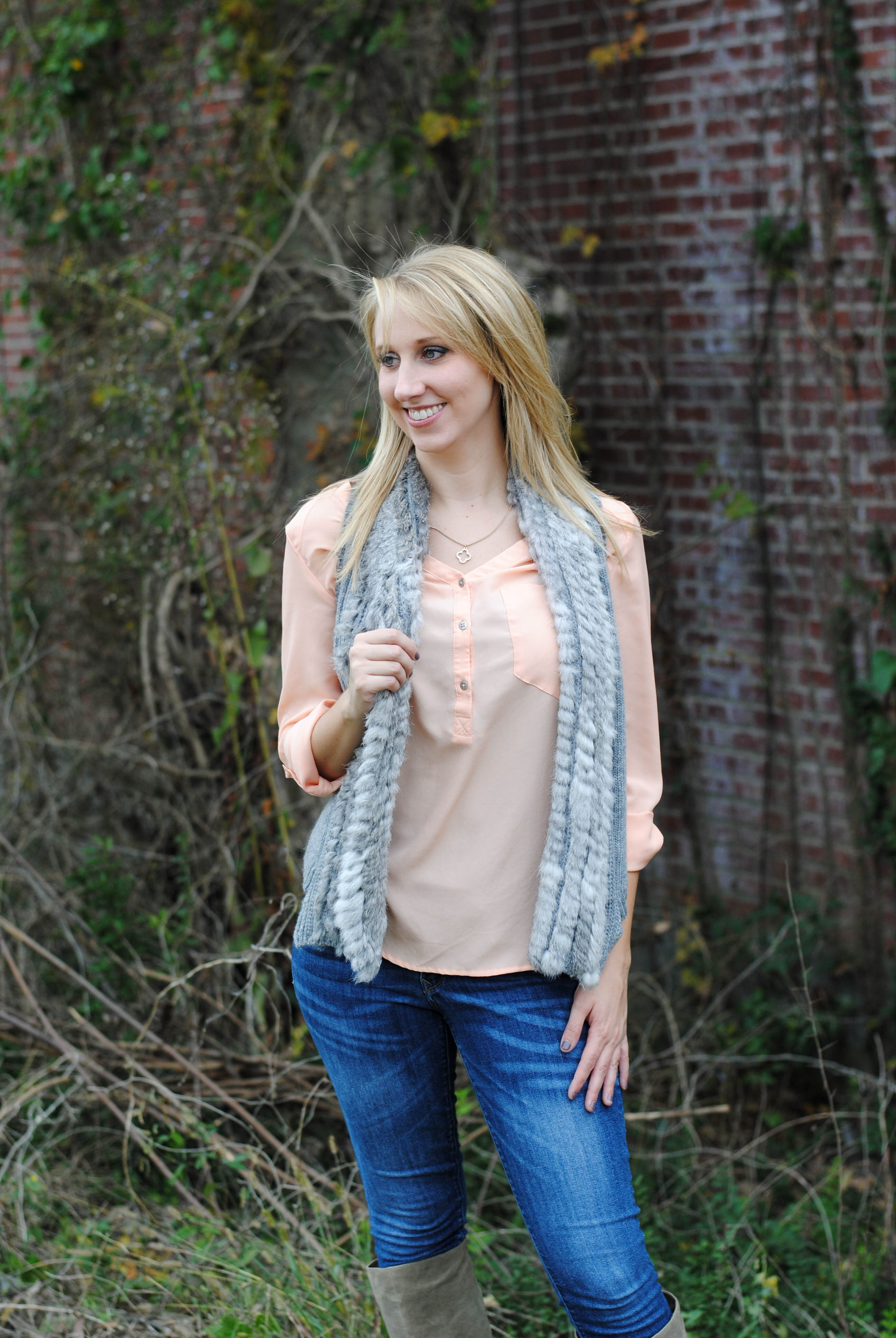 No one can deny that our weather here in Mississippi is crazy. One day it’s freezing and we have an excuse to pull out our heaviest coat but the next day is sunny and warm enough all you need is a light second layer. Lucky for us, we have had several of these beautiful days lately. I love these days to pull out my pieces that are too hot to wear in our Mississippi heat and too thin for our chilling winds. The combination of this acrylic peach top and lightweight knit and fur vest is the perfect combination for this beautiful weather.