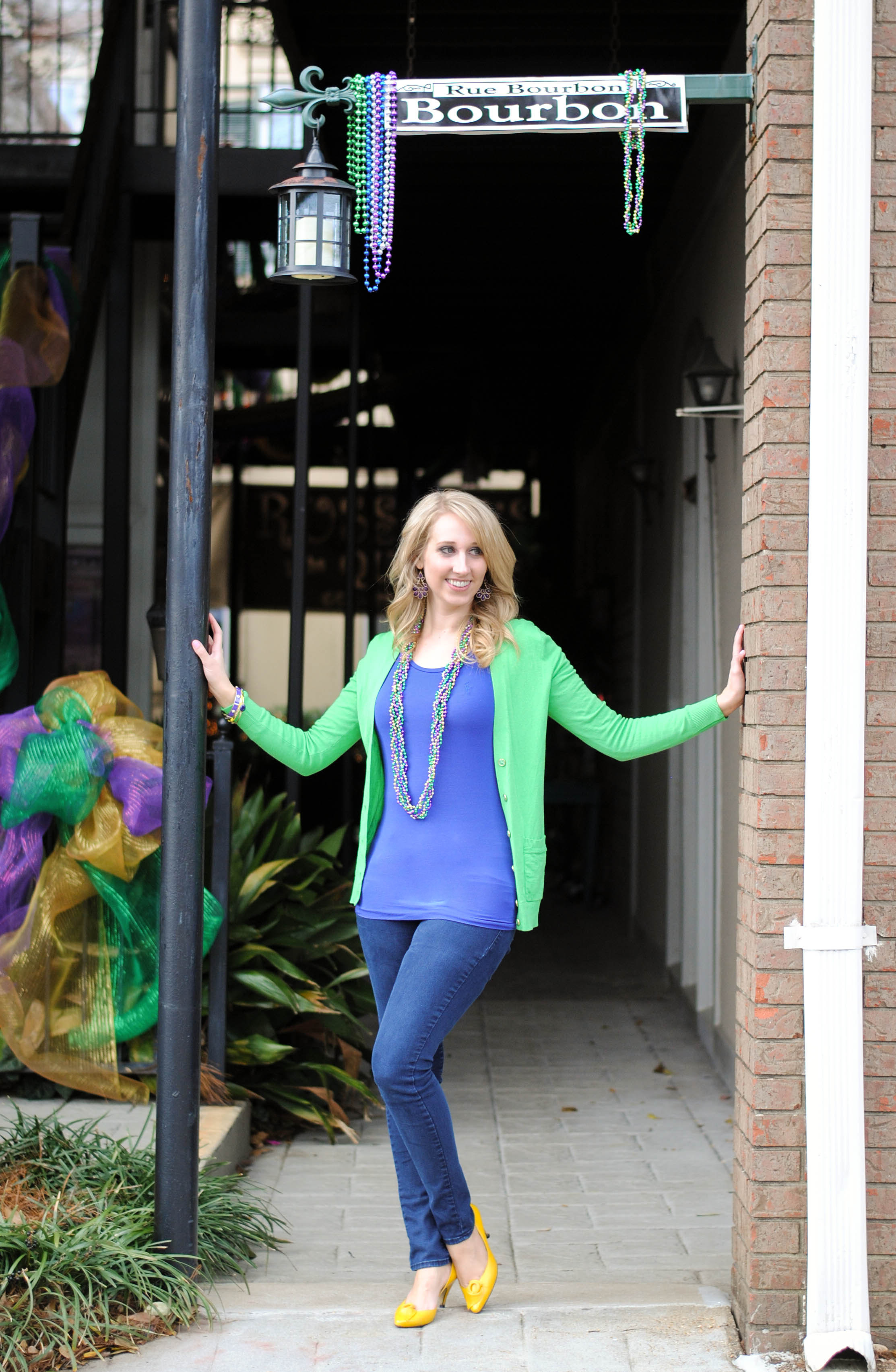 When it comes to Mardi Gras fashion it seems the majority of people have the mindset of “Anything Goes!” but I say, be cute, be colorful (purple, green, and gold!), and be comfortable. It’s a long day of parade watching, bead catching, and crowd searching.